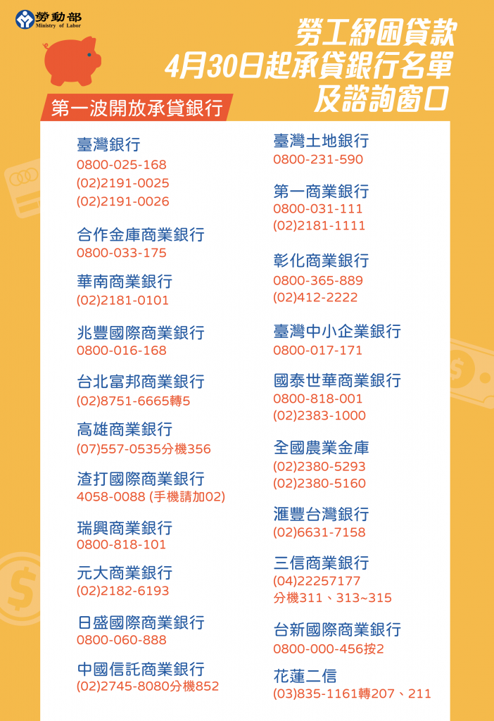 勞工紓困貸款申請辦法及承貸銀行,請參考勞動部網站: