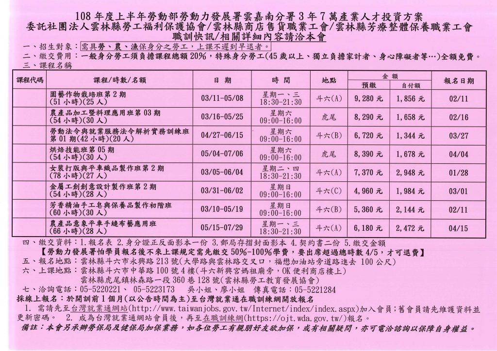 108年上半年本服務中心相關單位職訓班開班快訊~~
