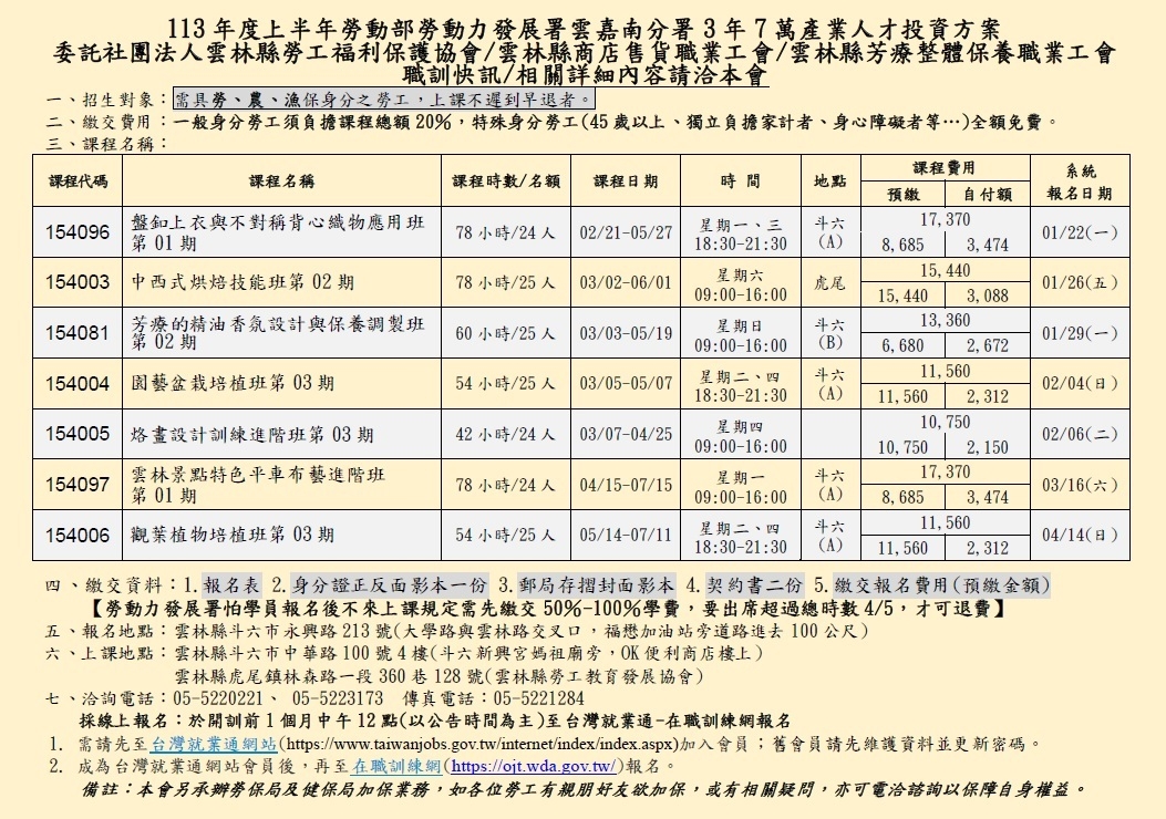 View Larger Image 113年度上半年產投職訓課程–DM By 管理員|2024-12-26T18:43:32+08:002024-01-19|勞工福利, 商店售貨, 在職訓練, 最新消息, 病患家事, 社區服務, 芳療整體, 褓姆職業, 西點麵包|在〈113年度上半年產投職訓課程–DM〉中留言功能已關閉 請選擇您想分享此網站的平台! FacebookXRedditLinkedInWhatsAppTelegramTumblrPinterestVkXingEmail: About the Author: 管理員 相關文章: 114年度雲林縣職業工會聯合服務中心年度紀念品領取通知〜 114年度雲林縣職業工會聯合服務中心年度紀念品領取通知〜 114上半年產業人才投資方案職業訓練課程–公告 114上半年產業人才投資方案職業訓練課程–公告 113年度「雲林縣職業工會聯合服務中心」年度紀念品好禮四選一(領取期間:4/10-5/10)〜 Gallery 113年度「雲林縣職業工會聯合服務中心」年度紀念品好禮四選一(領取期間:4/10-5/10)〜 113年度工會會員意外團保福利專案–歡迎會員洽詢 Gallery 113年度工會會員意外團保福利專案–歡迎會員洽詢