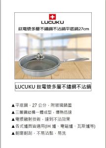 💋好禮一︰LUCUKU 鈦電漿多層不鏽鋼不沾平底鍋(27公分附玻璃鍋蓋)