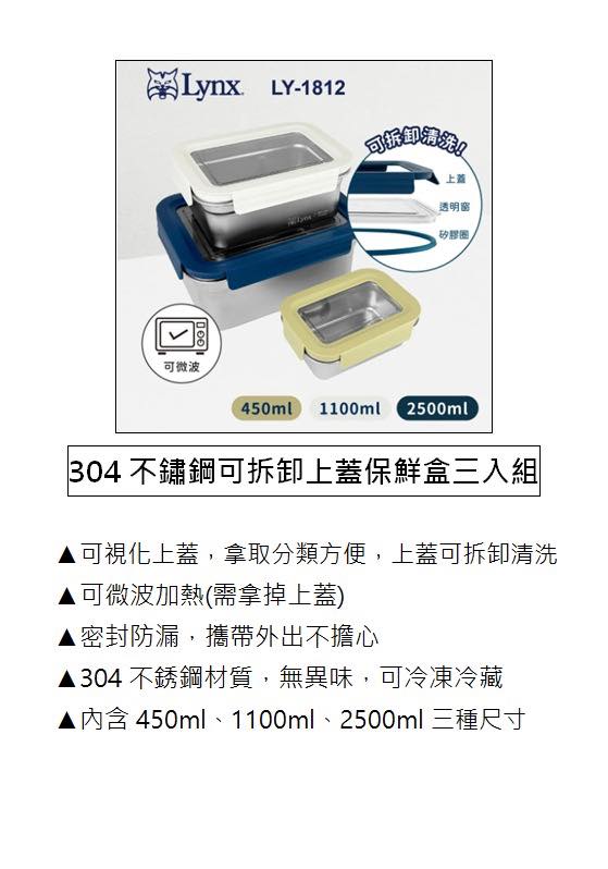 好禮三:Lynx 304不鏽鋼可拆卸上蓋保鮮盒 (三入組含 450ml / 1100ml / 2500ml 三種尺寸)